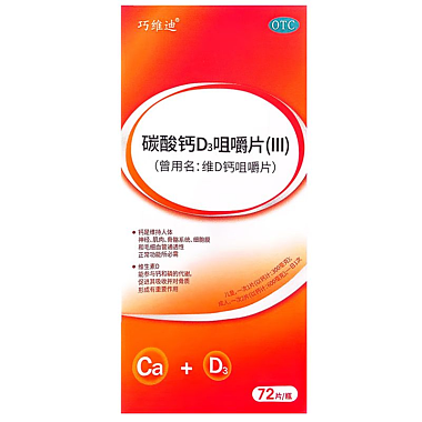 华纳 碳酸钙D3咀嚼片 72片/瓶(每片含维生素D3100国际单位(2.5微克),碳酸钙0.75克(相当于钙300毫克) 湖南华纳大药厂股份有限公司